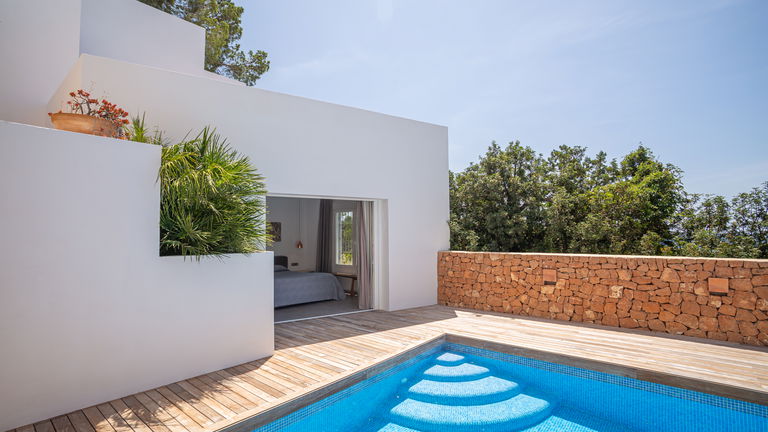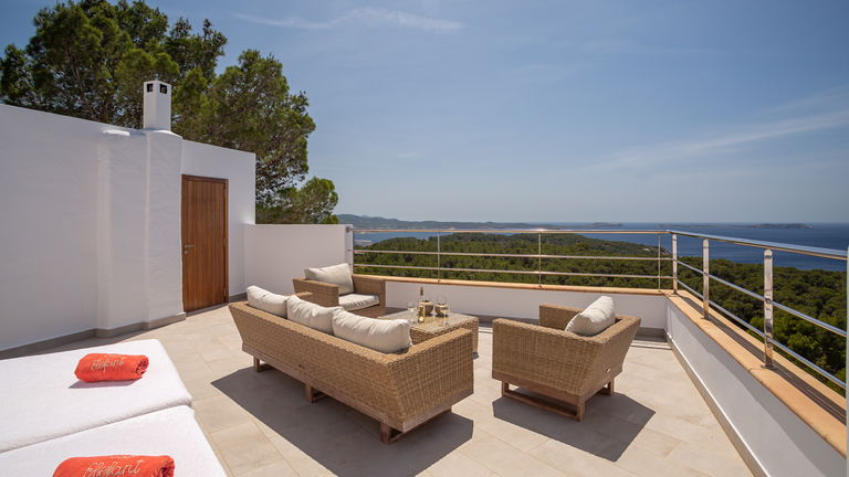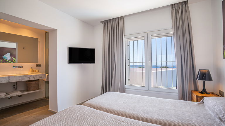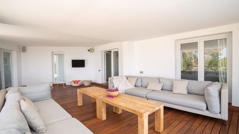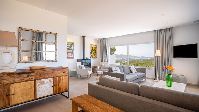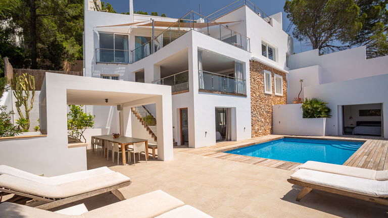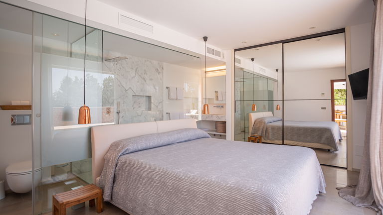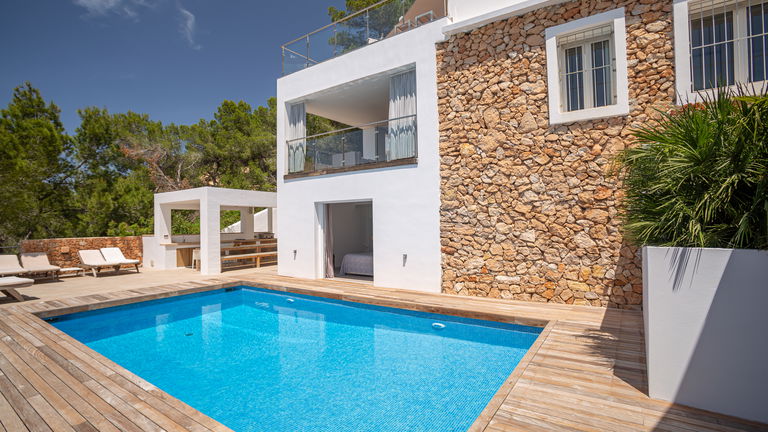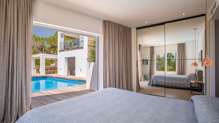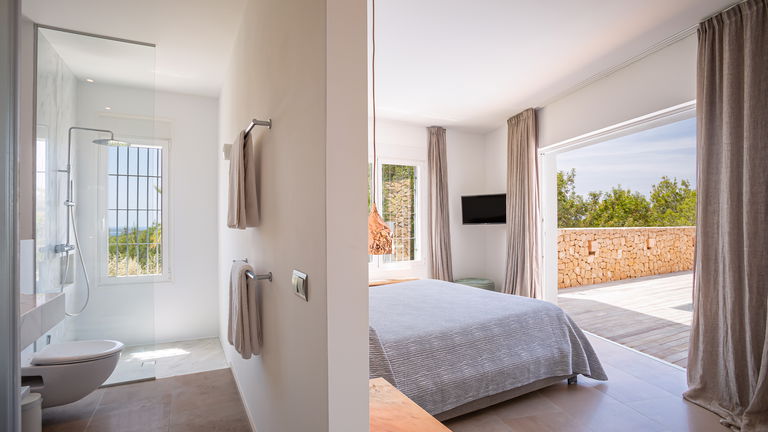 Esta lujosa villa en Cala Salada tiene capacidad para alojar a doce personas y cuenta con seis habitaciones dobles, todas con baño en suite. Cinco de ellas se encuentran en la planta baja, con acceso directo a la terraza, mientras que la sexta habitación está ubicada en el primer piso, ofreciendo mayor privacidad.