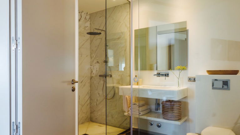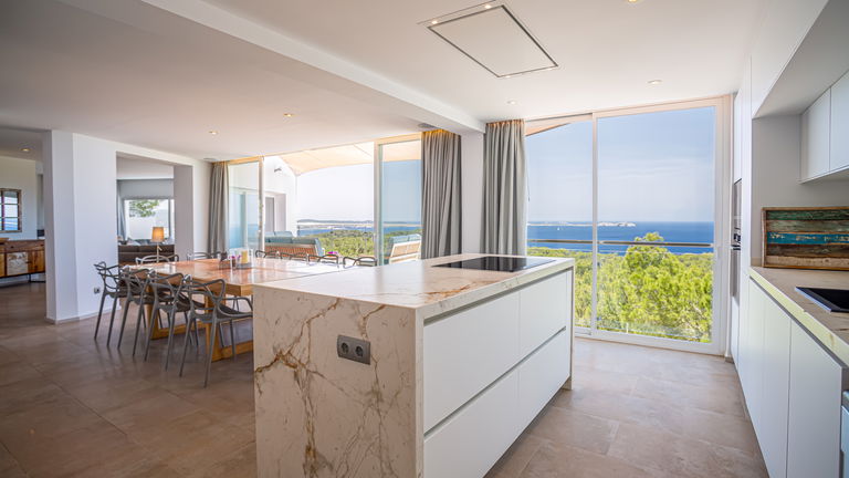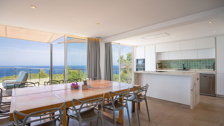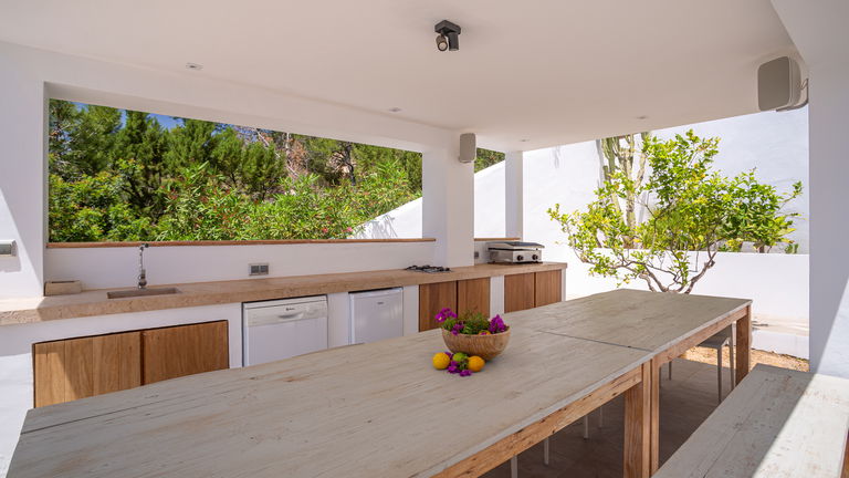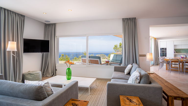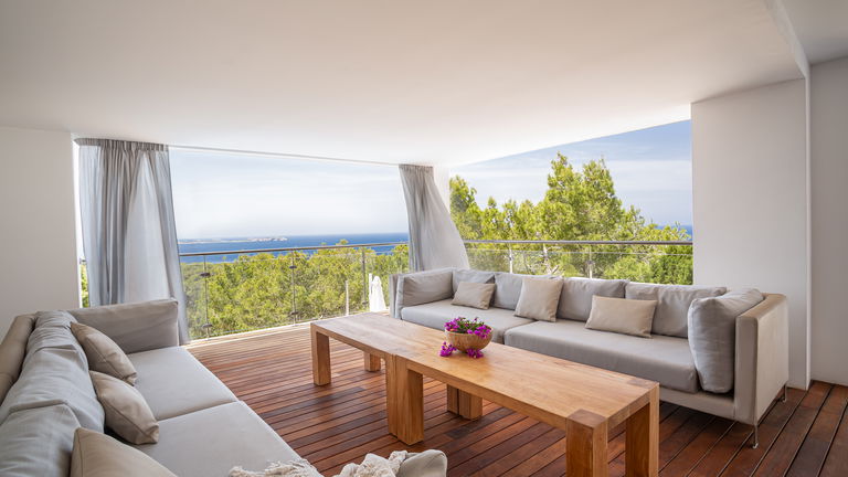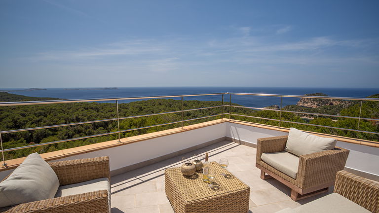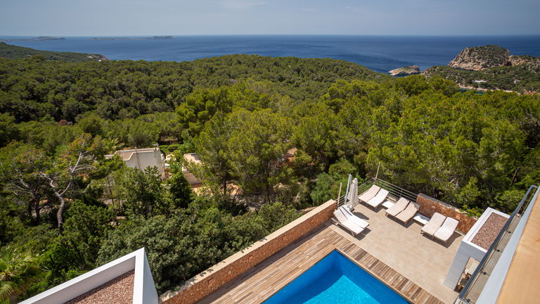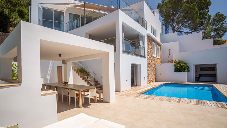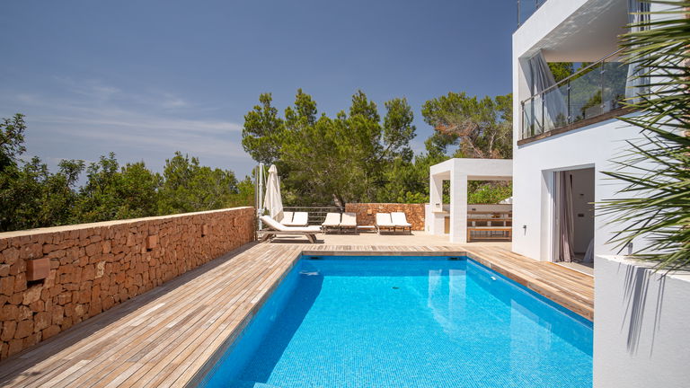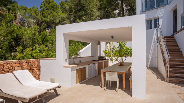 Esta lujosa villa en Cala Salada tiene capacidad para alojar a doce personas y cuenta con seis habitaciones dobles, todas con baño en suite. Cinco de ellas se encuentran en la planta baja, con acceso directo a la terraza, mientras que la sexta habitación está ubicada en el primer piso, ofreciendo mayor privacidad.